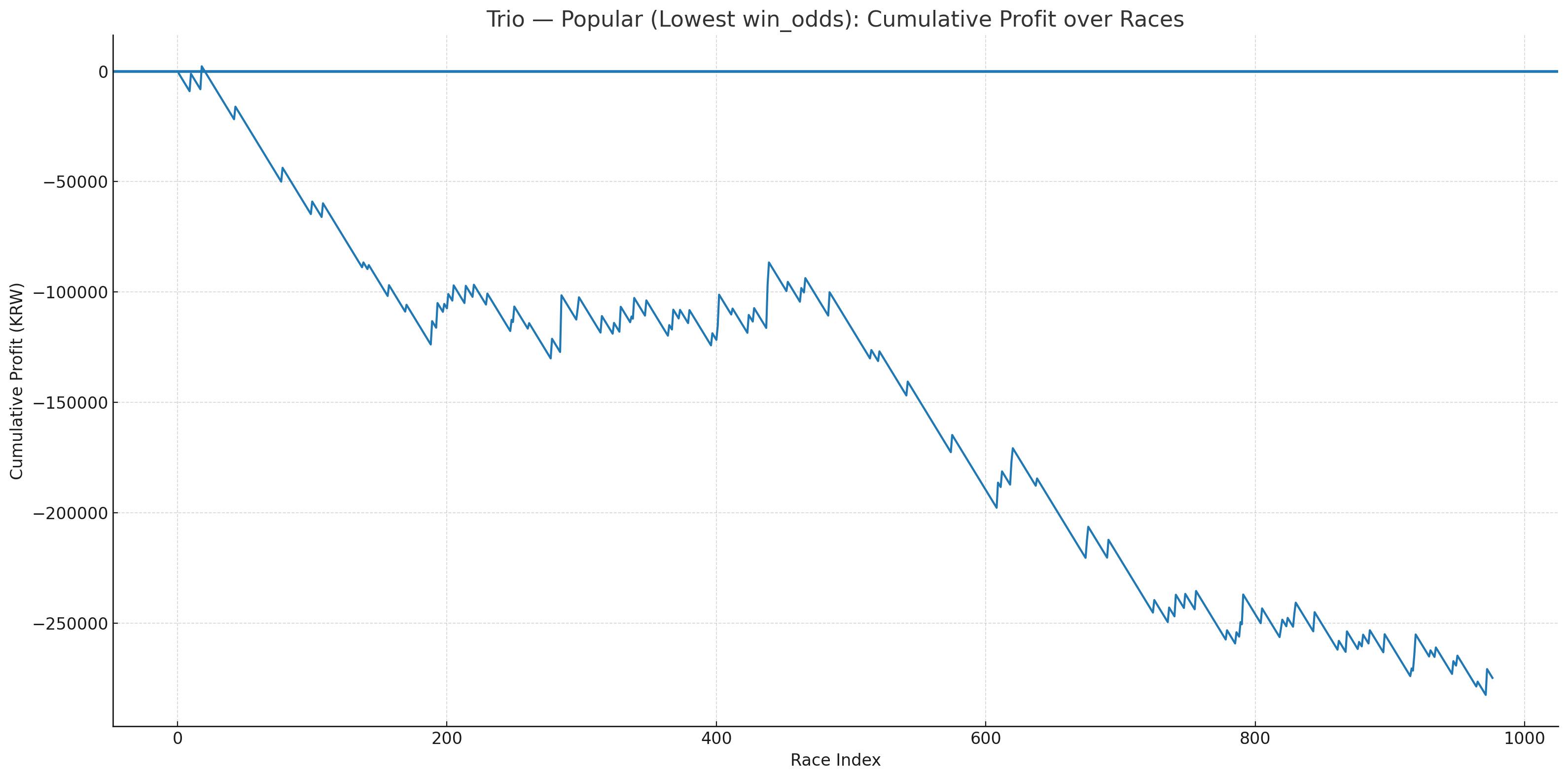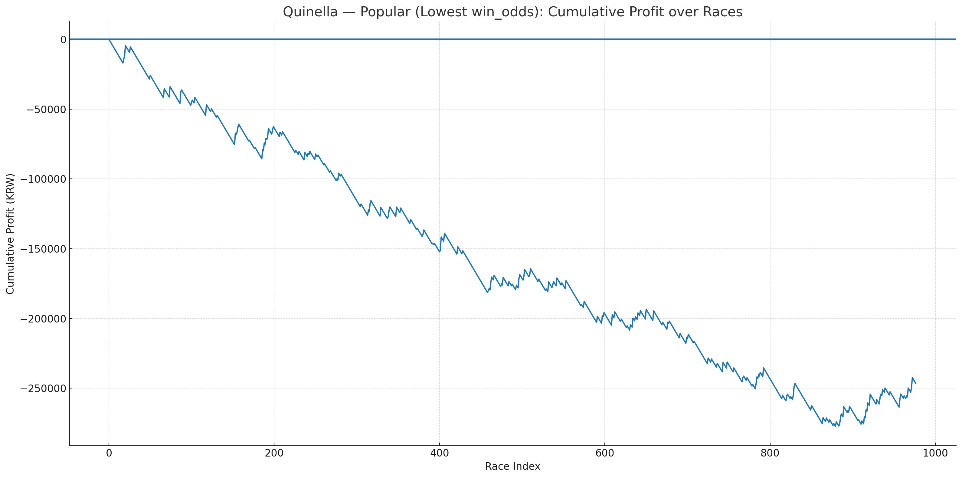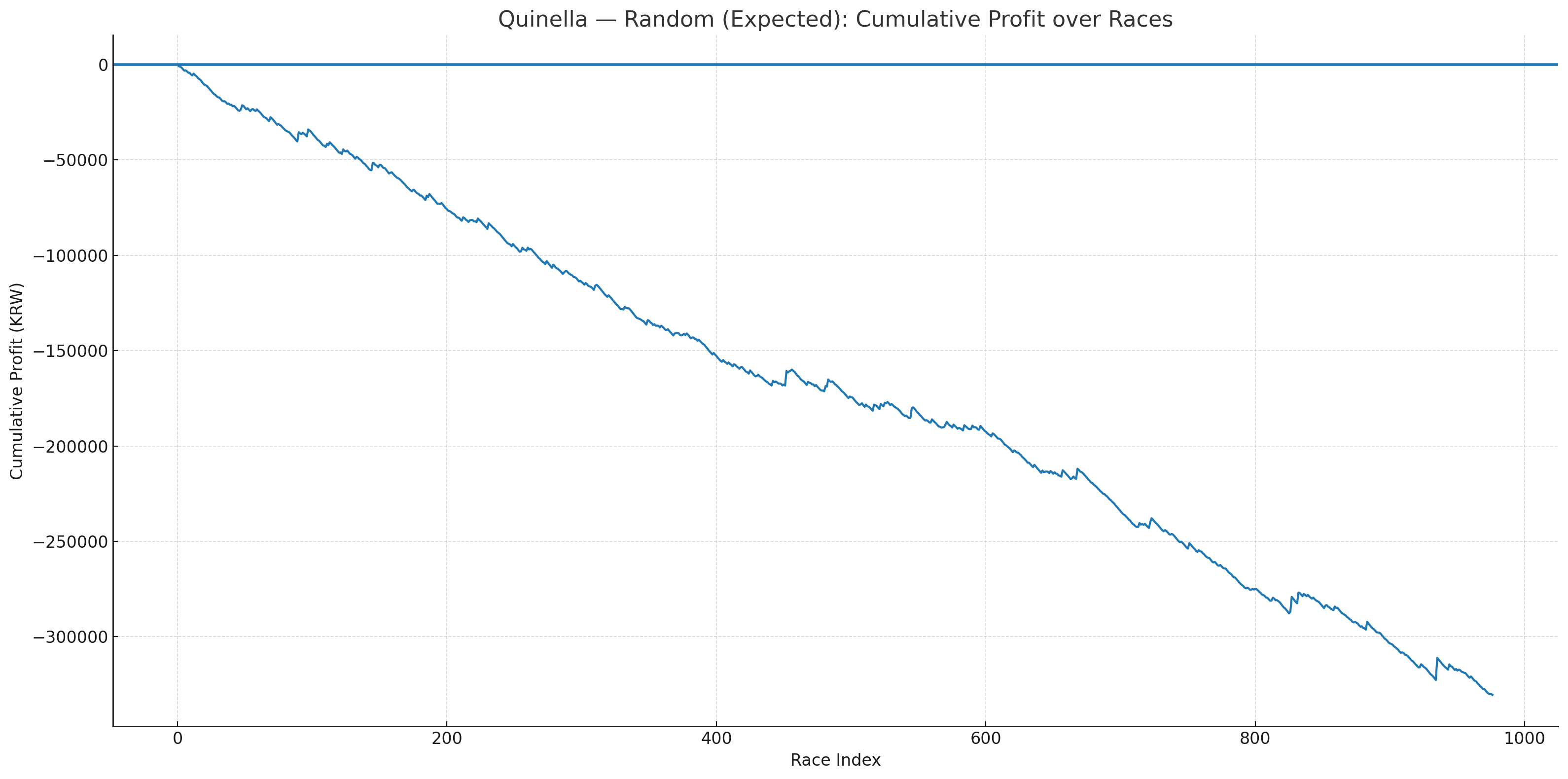 해당 모델이 유의미한지 알아보기 위해 경마 순위 예측 모델 없이도 긍정적인 수익을 얻을 수 있는지 실험해 보겠습니다.