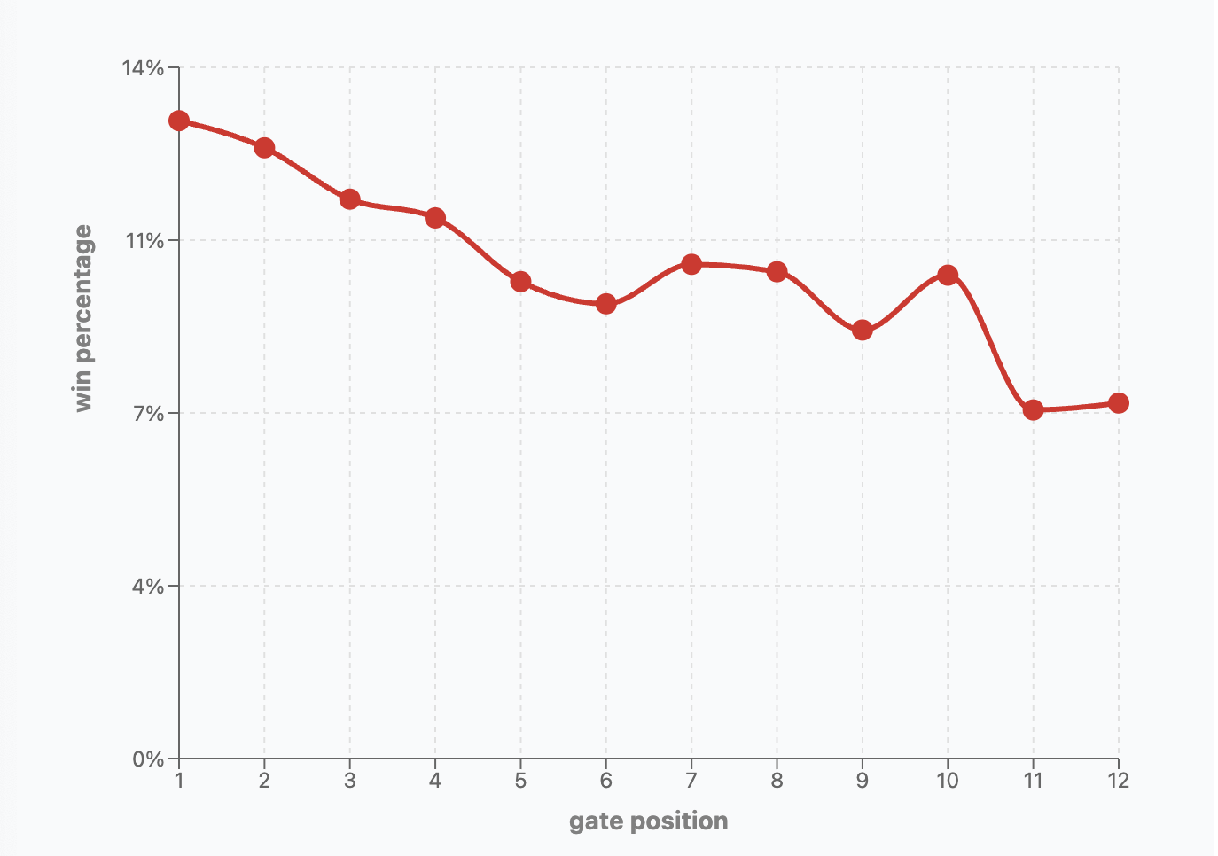 출발 위치는 경마에서 중요한 변수중 하나입니다. 실제 과거 경주데이터를 분석한 결과 출발 위치가 1 번부터 3번 말들의 경우 10번 이상의 출발위치에 있는 말들에 비해 경주에서 우승할 확률이 약 3% 정도 더 높습니다. 출발 위치가 작을수록 말이 안쪽 코너에 더 가깝게 달려 거리가 짧아지기 때문입니다.