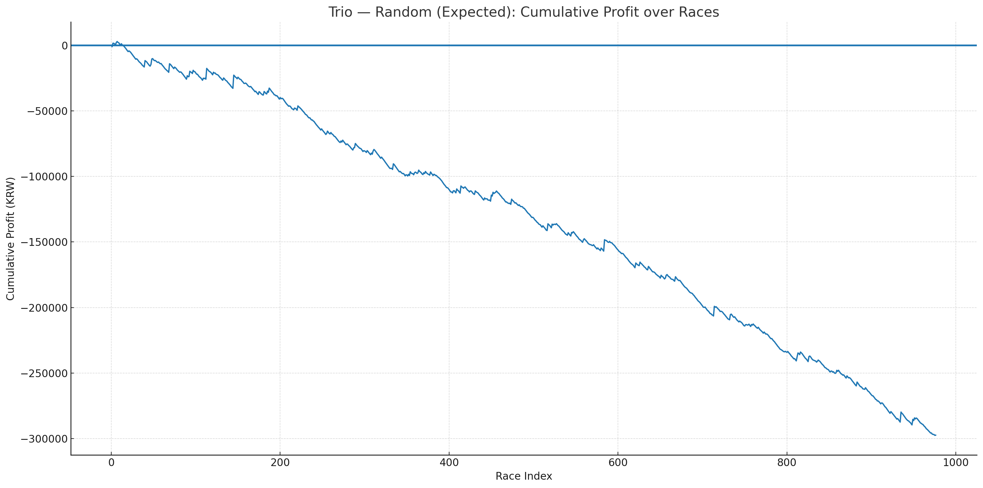 각 경주에 1000원씩 배팅하여 무작위 말을 선택했습니다. 적중률 0.90%, ROI -30.47%/경주의 마이너스 수익이 나왔습니다.